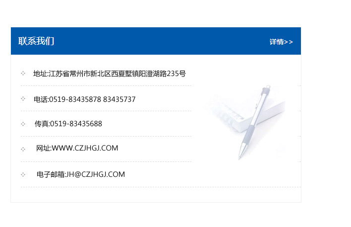 地址:常州市新北區(qū)友邦商務(wù)大廈1幢16、17層  電話:0519-85101652  傳真:0519-85112595  郵編:213022  網(wǎng)址:www_cz-jiayue_cn.famishu.com  郵箱:xiajifengaa@163.com